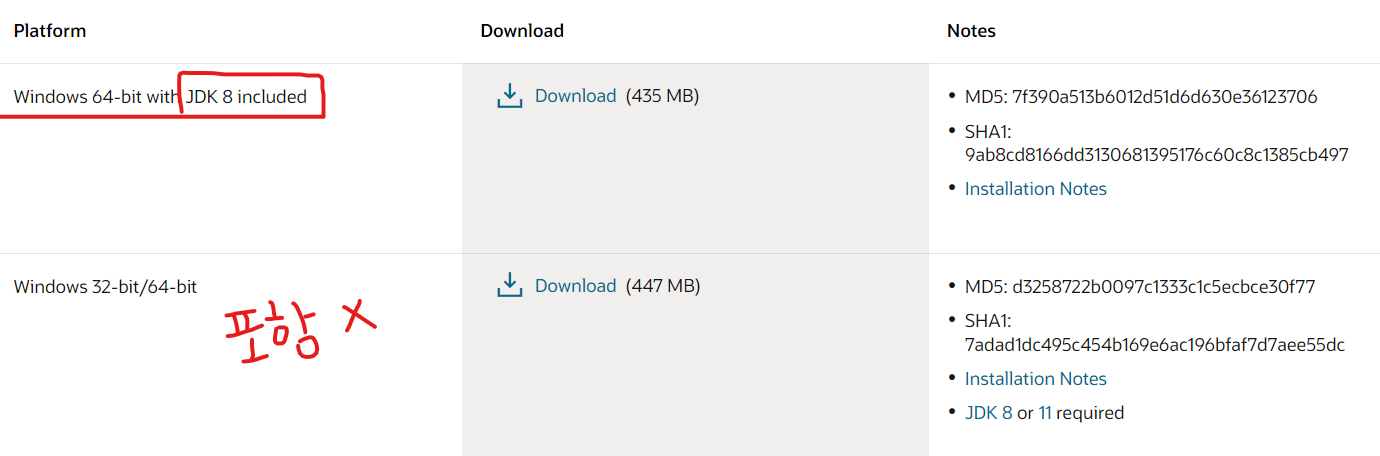 - JDK 포함 / 미포함 확인 후 해당하는 것 다운로드