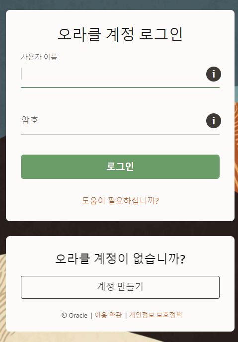 - 설치버튼 누르면 계정 로그인 하라고 뜨는데, 오라클 계정이 없다면 회원가입이 필요하다.