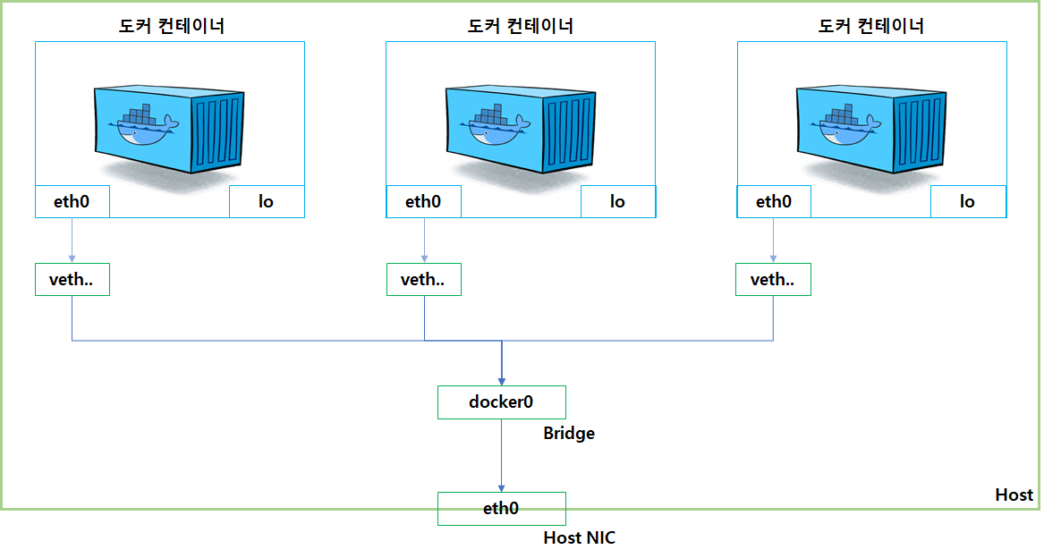 - docker0 브리지는 각 veth 인터페이스와 바인딩되어 호스트의 eth0 인터페이스와 이어주는 역할을 한다.